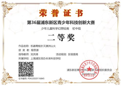 2020-12-16 schooladmin 第36届浦东新区青少年科技创新大赛中获奖同学名单 少年儿童科学幻想绘画初中组二等奖——六(1)班程思源青少年科技创意初中组二等奖——六(3)班梁姝玥青少年科技创新成果(科学论文)物理和天文和能源科学(初中)组三等奖——六(4)班揭析文
